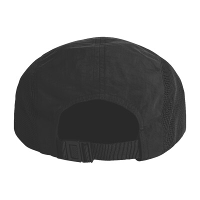 Low profile five panel cap, mesh side panels, adjustable plastic fastener, metal side eyelets, flat peak Light weight 100% recycled quick dry nylon body with 100% recycled polyester mesh One size fits all Tear-out AS Colour label